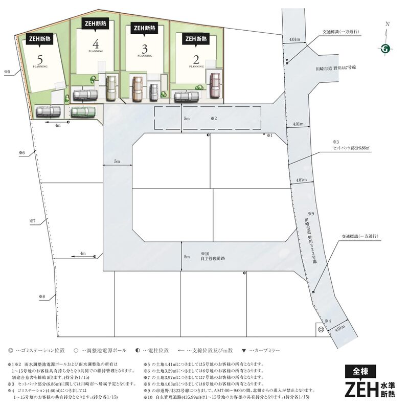 | 駐車場 | 2台 | 道路の幅員 | 4号棟:南5m/3号棟:南5m/5号棟:東5m/2号棟:南5m |