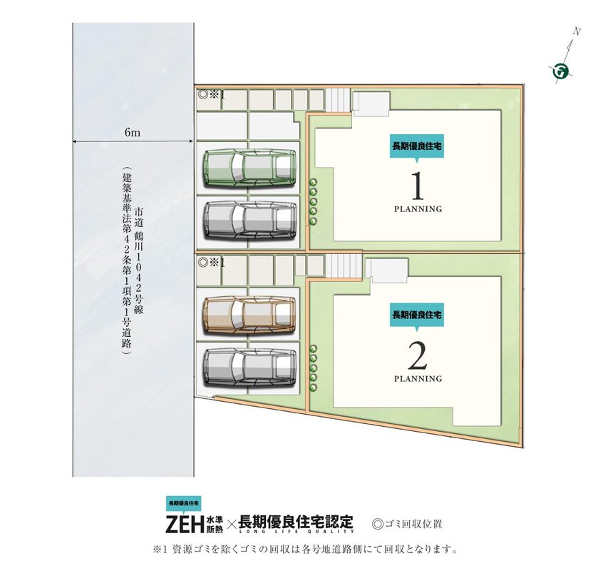 | 駐車場 | 2台 | 道路の幅員 | 2号棟:西6m |