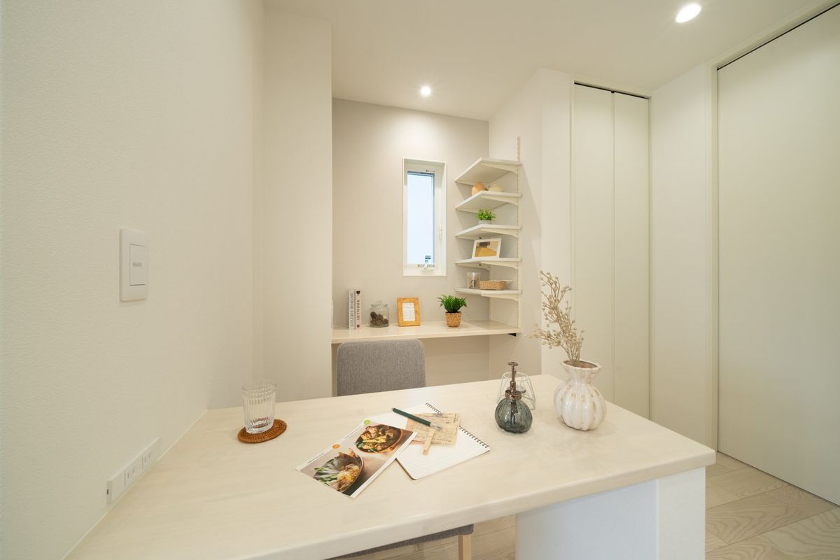リビング・ダイニング・キッチンがひと続きの間取りで、家族のつながりを感じやすい設計。生活動線もスムーズで毎日の暮らしが快適です。LDKと主寝室に備えられたワークスペースは、テレワークや趣味のスペースなど様々な用途にご活用いただけます。