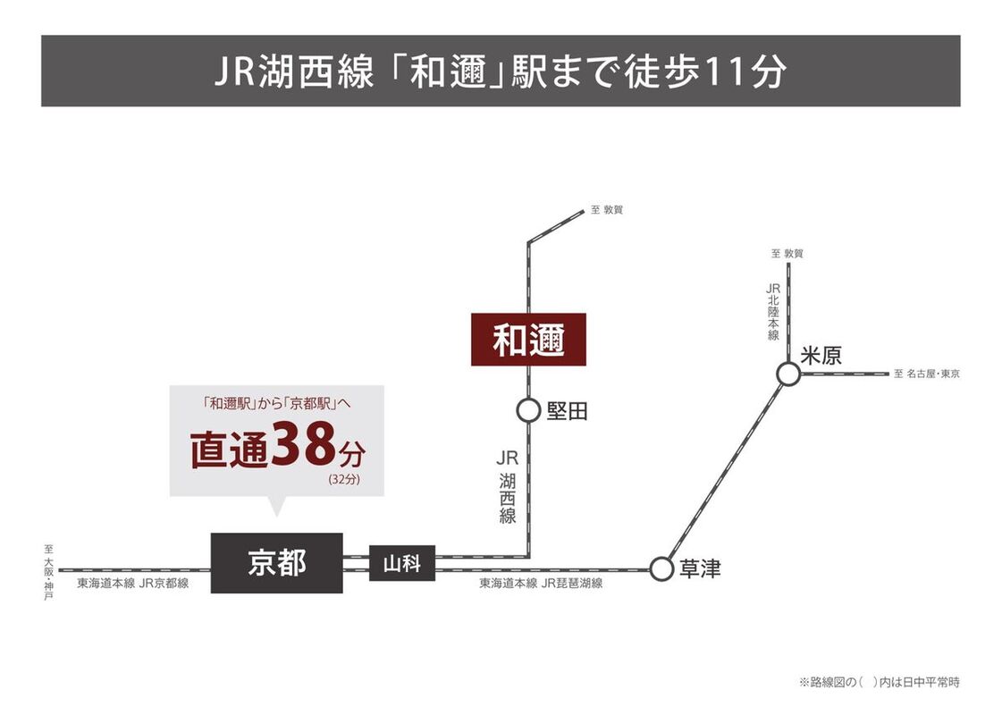 最寄駅の「和邇」駅から「京都」駅までは直通38分でアクセス可能なため、通勤・通学もスムーズです。「和邇」駅周辺にはスーパーやコンビニも揃っているため日々のお買い物にも便利な立地です。