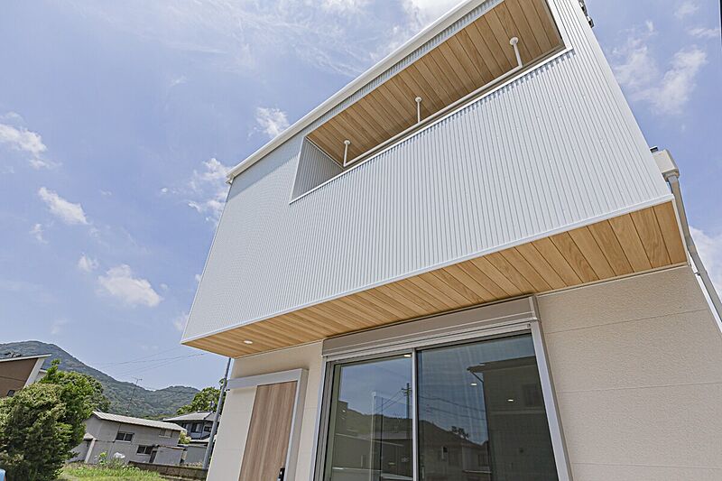 ホワイトの外壁をベースに、軒天には木調のアクセントをプラス。温...