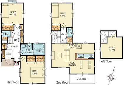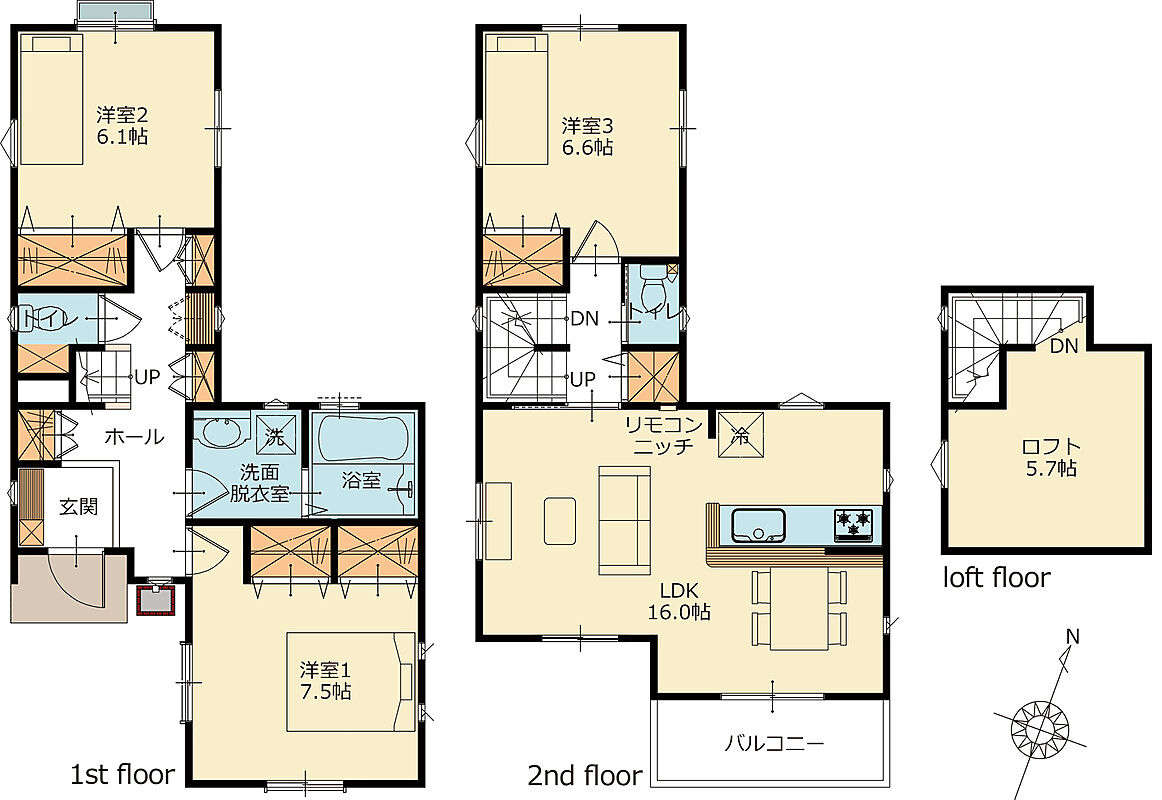 ●全居室6帖以上、5.7帖の大型ロフトなどこまめに収納スペースを配置した間取。●カースペースの幅が約3m、前面道路は8mで車の出入庫も楽にできます。●北側隣地も空間が空いており、採光・通風良好!