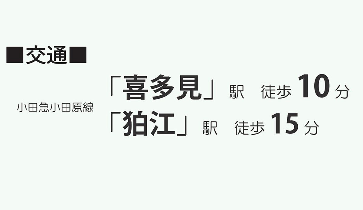 小田急小田原線「喜多見」駅 徒歩10分 小田急小田原線「狛江」駅 徒歩15分 小田急小田原線「成城学園前」駅 徒歩24分 |