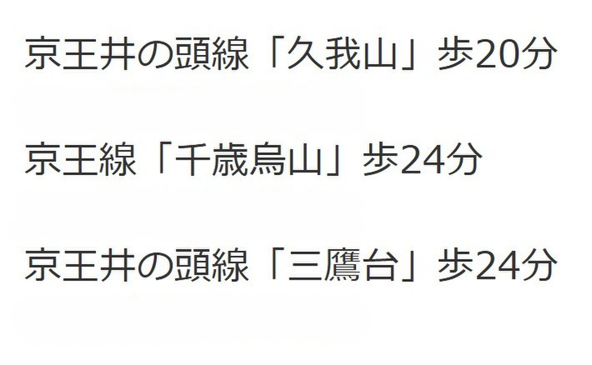 京王井の頭線「久我山」駅 徒歩20分 京王線「千歳烏山」駅 徒歩24分 JR中央線「吉祥寺」駅 バス19分「北野水無」バス停 徒歩1分 |
