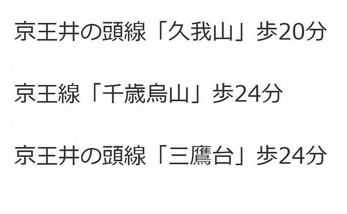 - 京王井の頭線「久我山」駅 徒歩20分京王線「千歳烏山」駅 徒歩24分JR中央線「吉祥寺」駅 バス19分「北野水無」バス停 徒歩1分