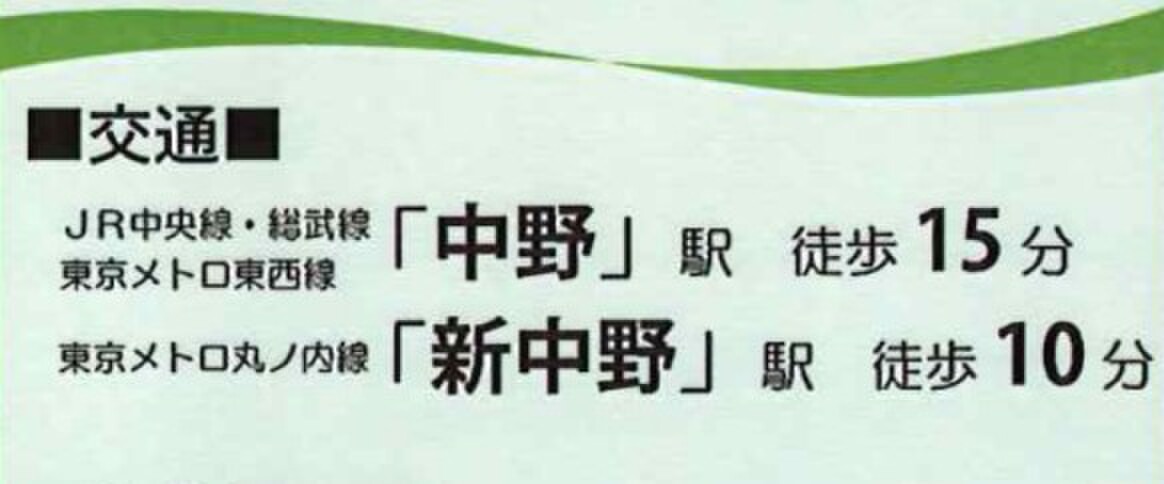 JR中央線「中野」駅 徒歩15分 東京メトロ丸ノ内線「新中野」駅 徒歩10分 東京メトロ丸ノ内線「中野坂上」駅 徒歩12分 |