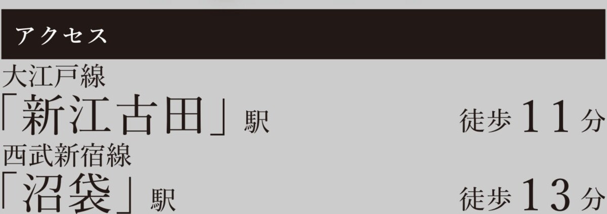 - 都営大江戸線「新江古田」駅 徒歩11分西武新宿線「沼袋」駅 徒歩13分西武新宿線「新井薬師前」駅 徒歩18分
