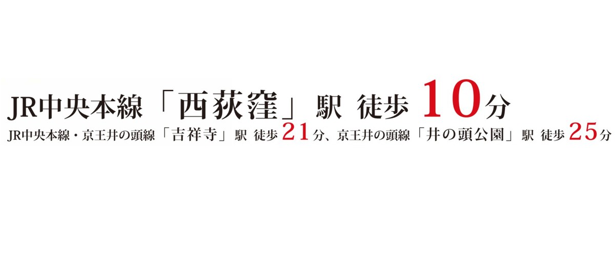 JR中央線「西荻窪」駅 徒歩10分 JR中央線「吉祥寺」駅 徒歩21分 京王井の頭線「井の頭公園」駅 徒歩25分 |