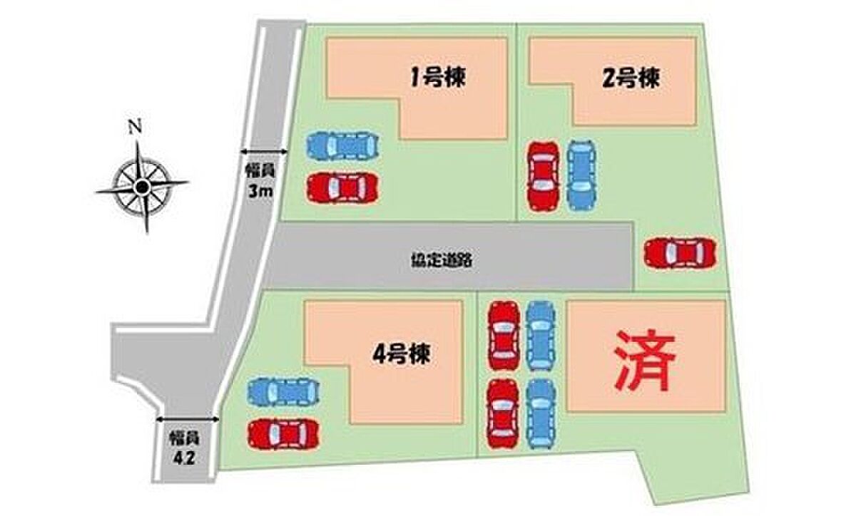 | 駐車場 | 2台 ~ 4台(1・4号棟(2台)、2号棟(3台)) | 道路の幅員 | 道路幅:3m、アスファルト舗装、西側 約3.0m 公道接道 |