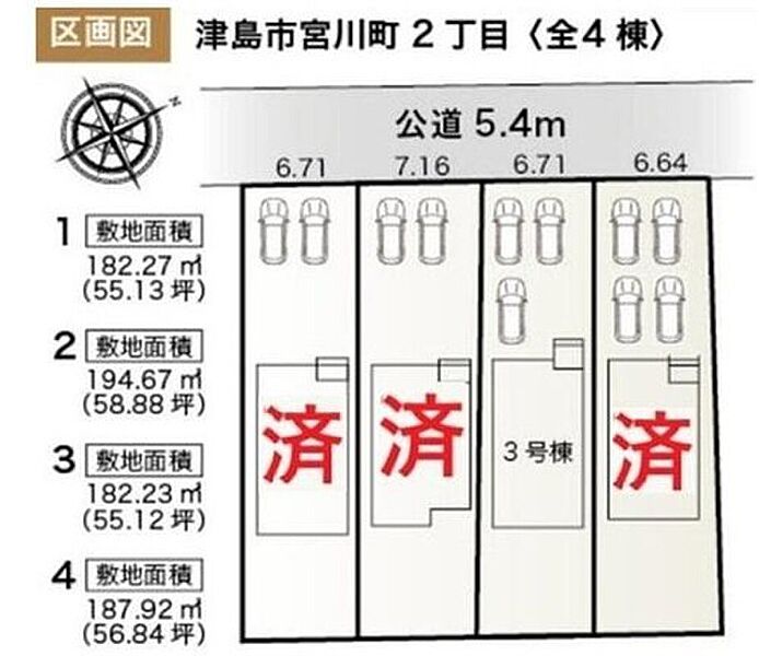 | 駐車場 | 3台 | 道路の幅員 | 道路幅:5.4m、アスファルト舗装、北西側 約5.4m 市道接道 |