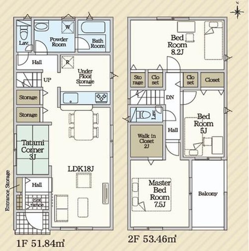 | 建物面積 | 105.3m2(31.85坪) | 土地面積 | 106.4m2・107.13m2(32.18坪・32.40坪) |