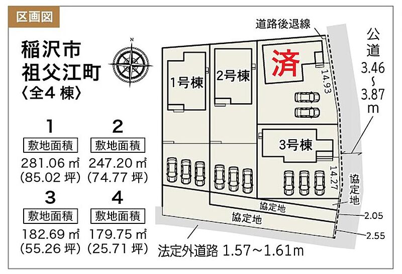 | 駐車場 | 3台 | 道路の幅員 | 道路幅:1.5m~3.4m、アスファルト舗装、東側 約3.46m~3.87m 他備考欄参照 |