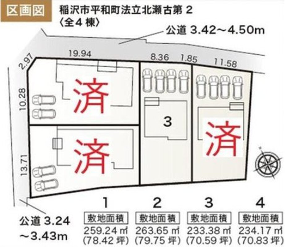 | 駐車場 | 4台 | 道路の幅員 | 道路幅:3.2m・4m、アスファルト舗装、北西側3.2m・北東側4.0m公道接道 |