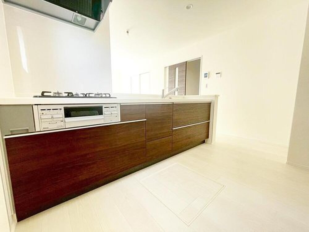 収納力豊富なシステムキッチン。大型スライド収納付きで、すっきり片付けやすいキッチンです♪