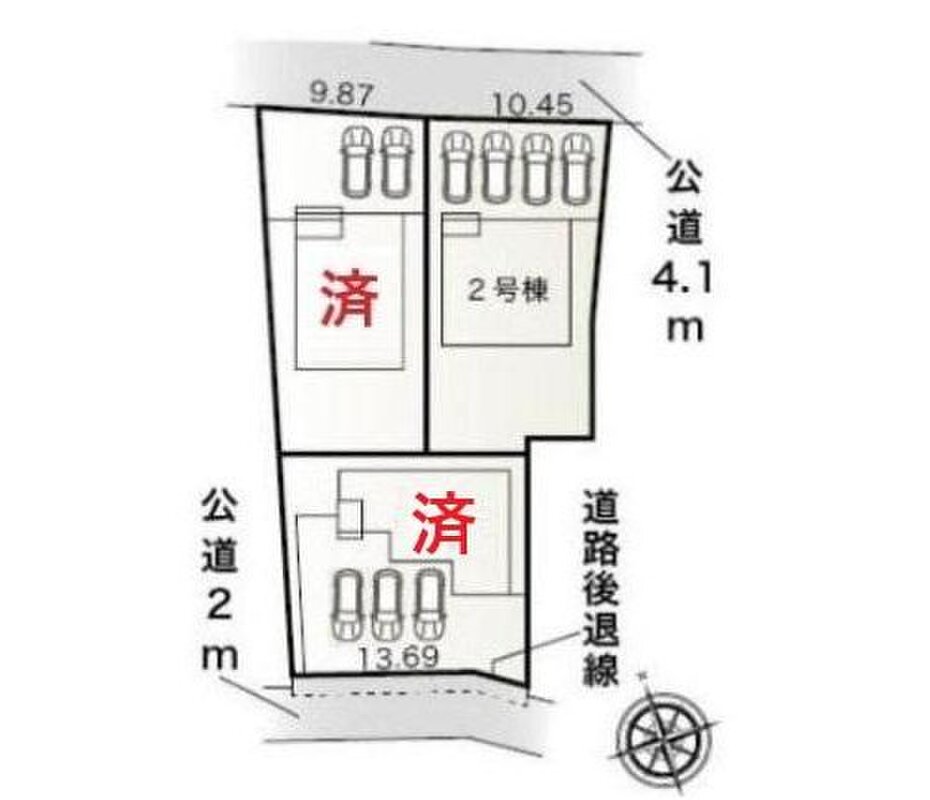| 駐車場 | 3台 ~ 4台(4台(2号棟)・3台(3号棟)) | 道路の幅員 | 道路幅:2m・4.1m、アスファルト舗装、南側 約2.0m、北側 約4.1m 公道接道 |