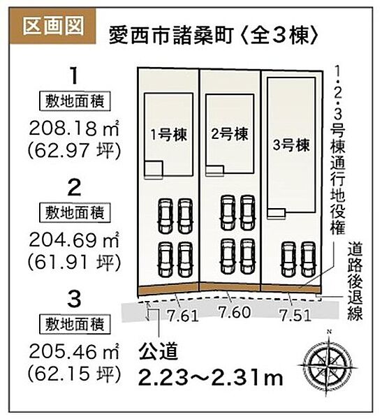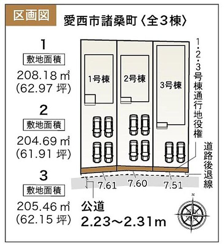 | 駐車場 | 2台 ~ 4台(3号棟のみ2台分) | 道路の幅員 | 道路幅:2.2m~2.3m、アスファルト舗装、南側 約2.2m~2.3m 公道接道 |
