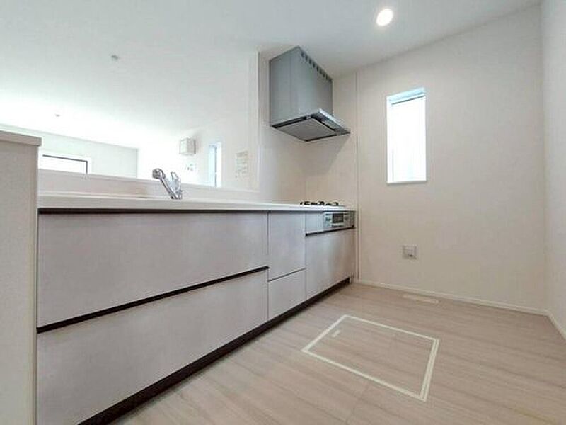 奥さまの思いの「ゆとり」サイズをセレクトしました。吊り戸には耐震ラッチ、キッチンカウンター下には大容量の収納スペースを確保しております。