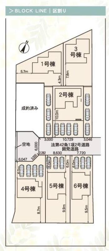 | 駐車場 | 3台 ~ 4台(1号棟(3台)・2号棟(4台)・3号棟(3台)・4号棟(4台)・5号棟(3台)・6号棟(3台)) | 道路の幅員 | 道路幅:3.8m、アスファルト舗装、東側 約3.8m 公道接道 |