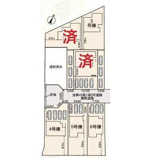 | 駐車場 | 3台 ~ 4台(1号棟(3台)・3号棟(3台)・4号棟(4台)・5号棟(3台)・6号棟(3台)) | 道路の幅員 | 道路幅:3.8m、アスファルト舗装、東側 約3.8m 公道接道 |