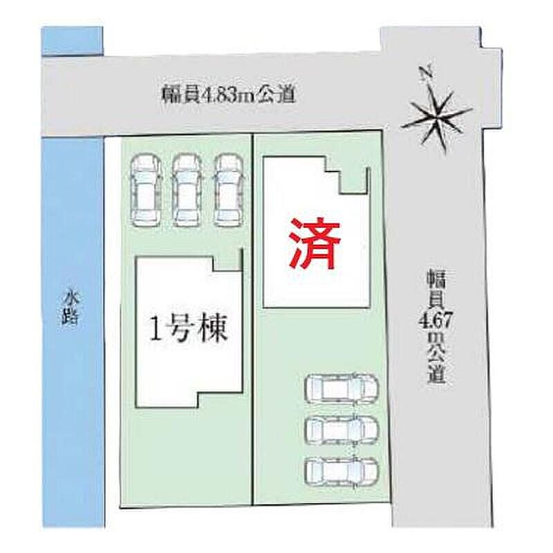 | 駐車場 | 3台 | 道路の幅員 | 道路幅:4.8m、アスファルト舗装、北側 約4.8m 公道接道 |