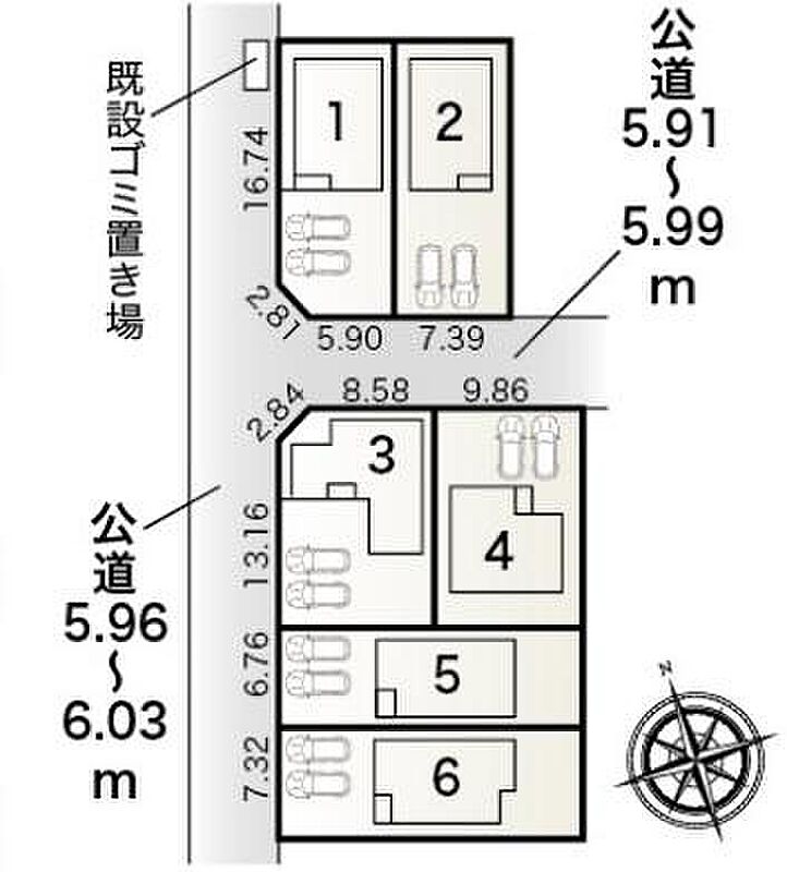 | 駐車場 | 2台 | 道路の幅員 | 道路幅:5.9m~6m、アスファルト舗装、西側 約5.9m~6.03m 以下備考欄へ記載 |
