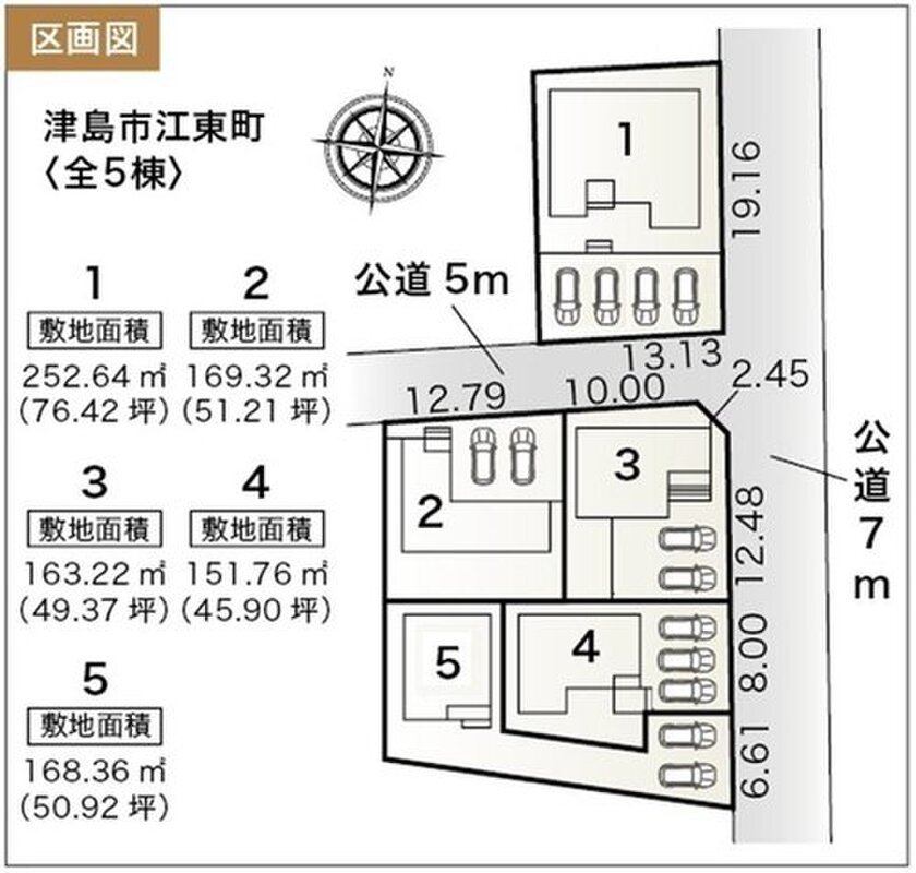 | 駐車場 | 2台 ~ 4台(2,3,5号棟2台分・4号棟3台分・1号棟4台分) | 道路の幅員 | 道路幅:5m・7m、アスファルト舗装、東側 約7.0m、南側 約5.0m、北側 約5.0m 公道接道 |