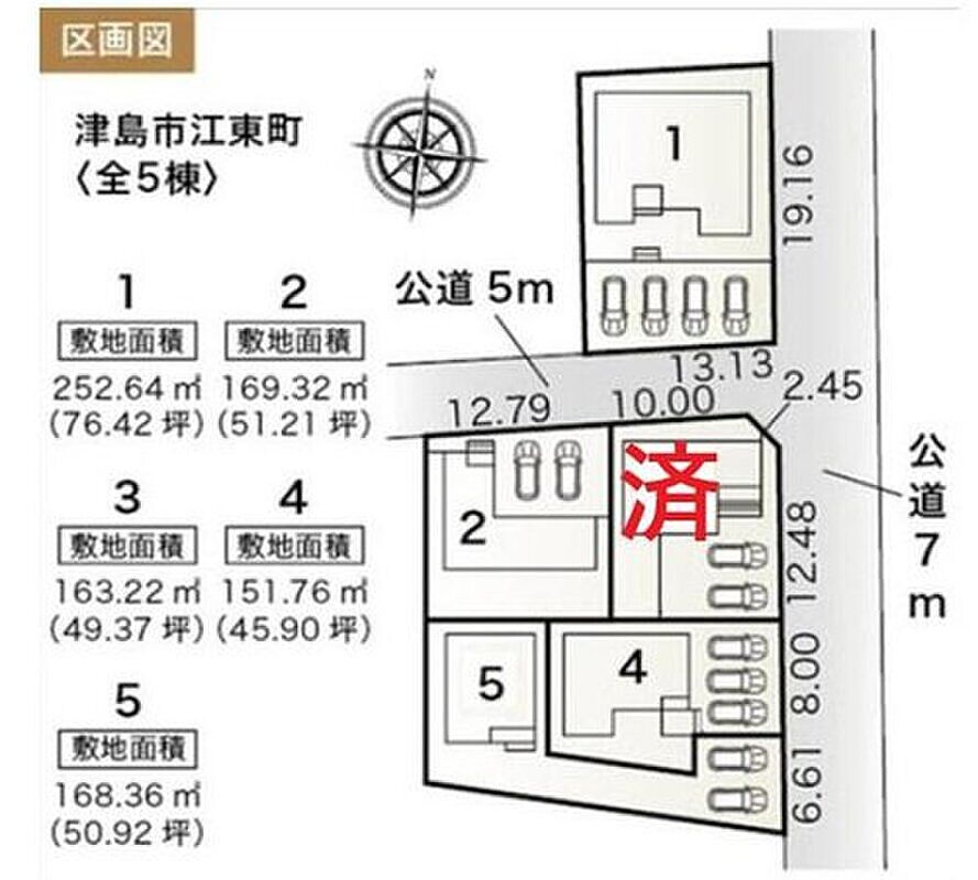 | 駐車場 | 2台 ~ 4台(2,5号棟2台分・4号棟3台分・1号棟4台分) | 道路の幅員 | 道路幅:5m・7m、アスファルト舗装、東側 約7.0m、南側 約5.0m、北側 約5.0m 公道接道 |