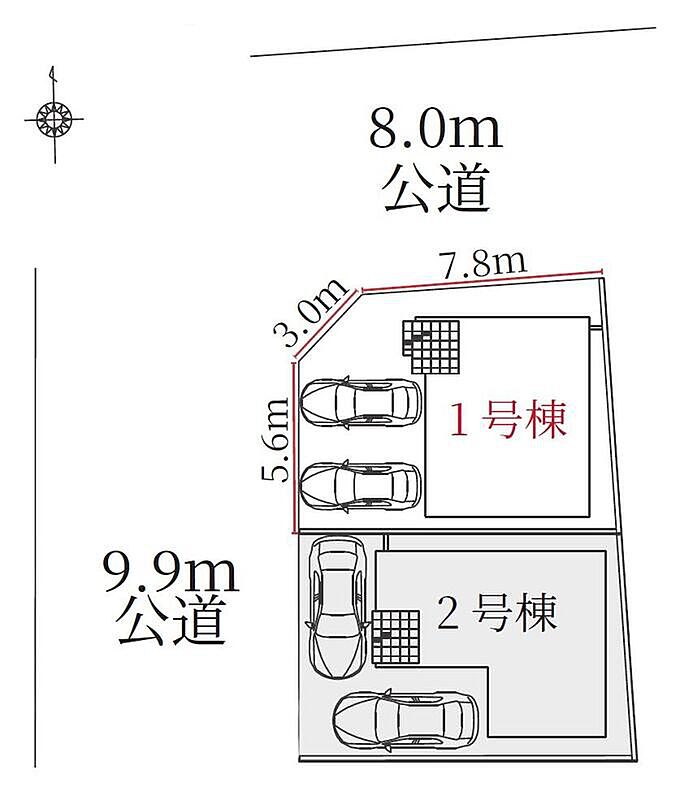 | 駐車場 | 2台 | 道路の幅員 | 道路幅:8m・9.9m、アスファルト舗装、北側 約8.0m 西側 約9.99m 公道接道 |