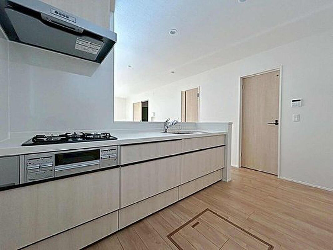吊り戸には耐震ラッチ、キッチンカウンター下には大容量の収納スペースを確保しております。