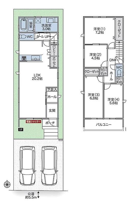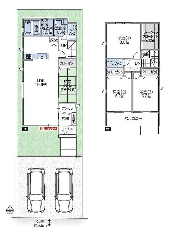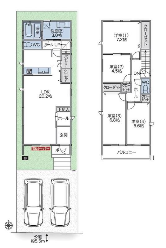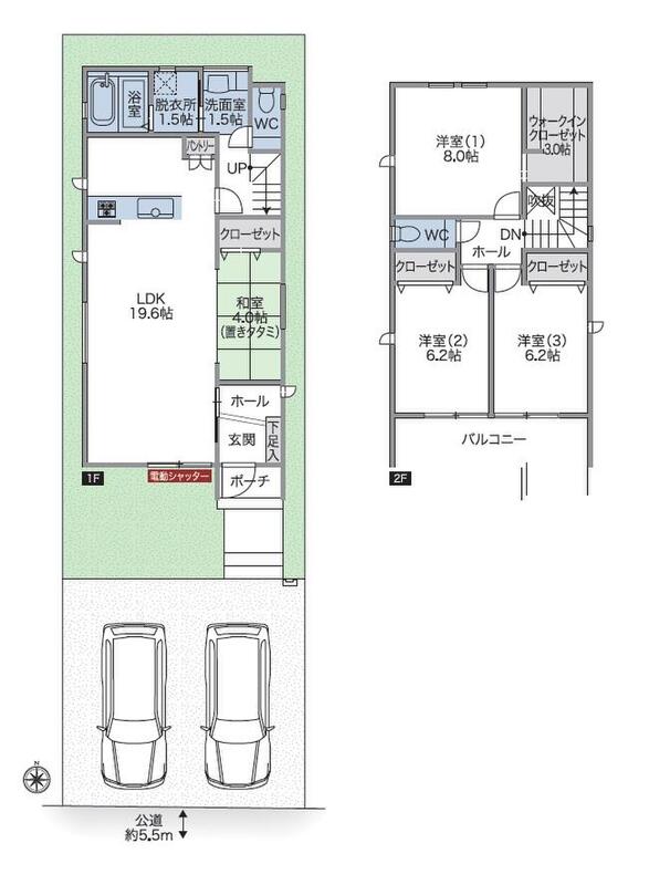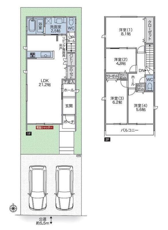 | 駐車場 | 2台 | 道路の幅員 | 道路幅:5.5m、アスファルト舗装、南側 約5.5m 公道接道 |