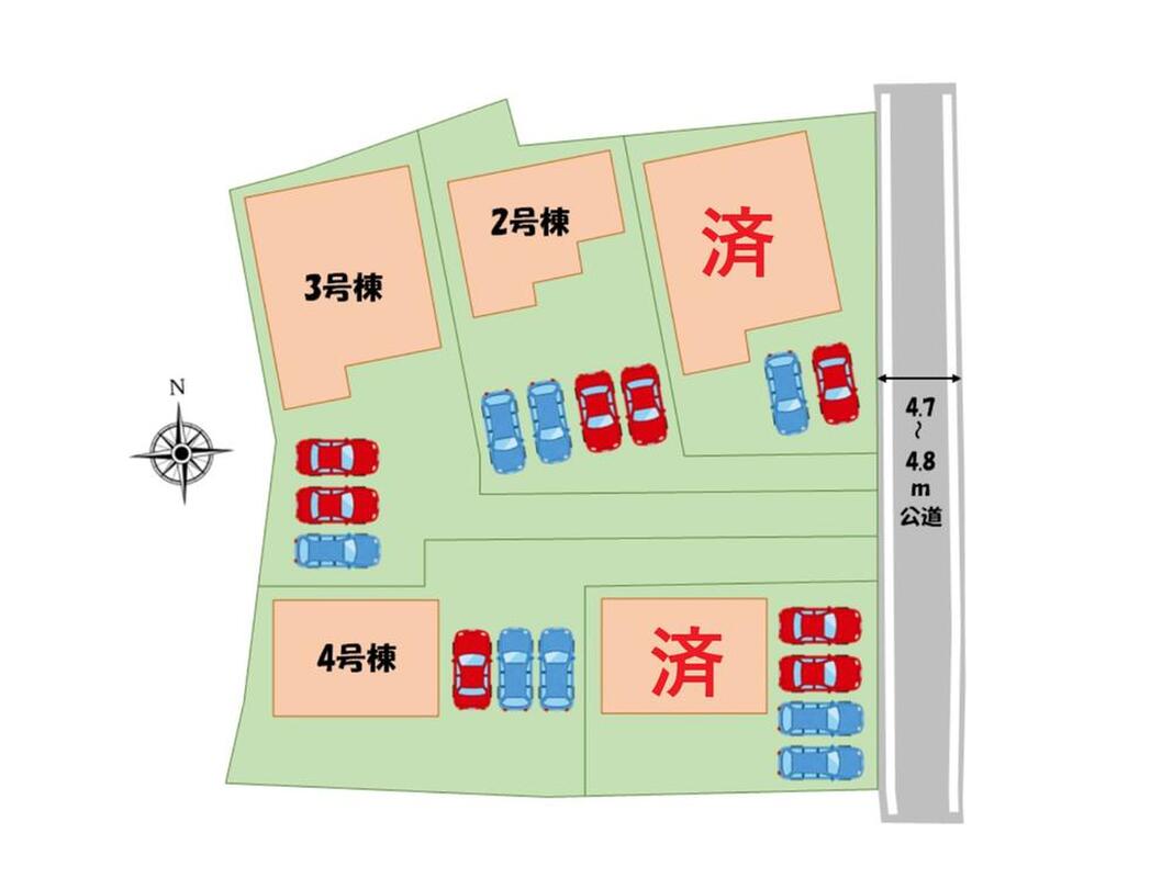| 駐車場 | 3台 ~ 4台(3台(2戸)・4台(1戸)、3・4号棟(3台)・2号棟(4台)) | 道路の幅員 | 道路幅:4.7m~4.8m、アスファルト舗装、東側 約4.7m~約4.8m 公道接道 |