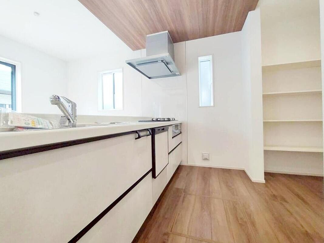 対面式キッチンからダイニングへお食事の受け渡しがスムーズにでき効率的です。お料理中もリビングが見渡せ安心♪会話がはずむ姿が想像できますね♪