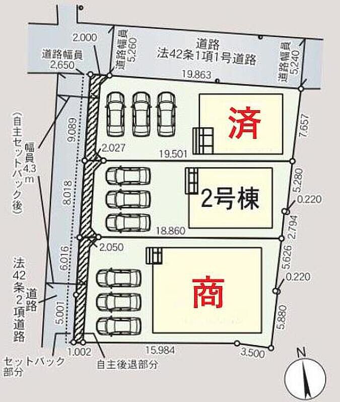 | 駐車場 | 3台 | 道路の幅員 | 道路幅:2.3m~2.6m、アスファルト舗装、西側 約2.3m~約2.6m公道接道 |
