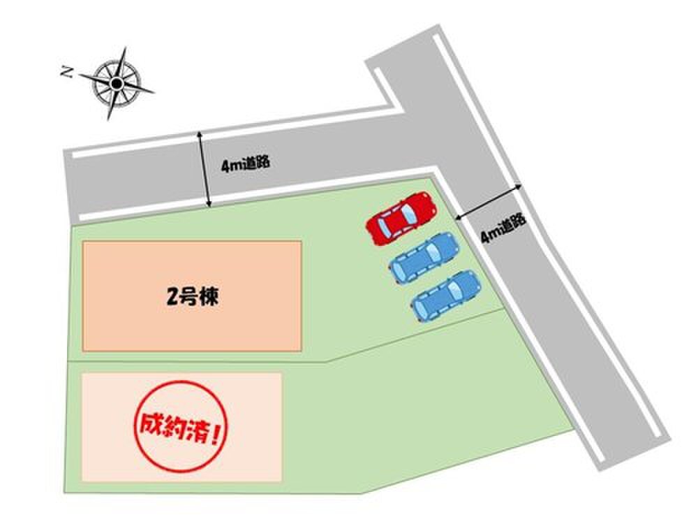 | 駐車場 | 3台 | 道路の幅員 | 道路幅:2.3m~4m、アスファルト舗装、東側 約2.3m~2.8m 南側 約4.0m 公道接道 |