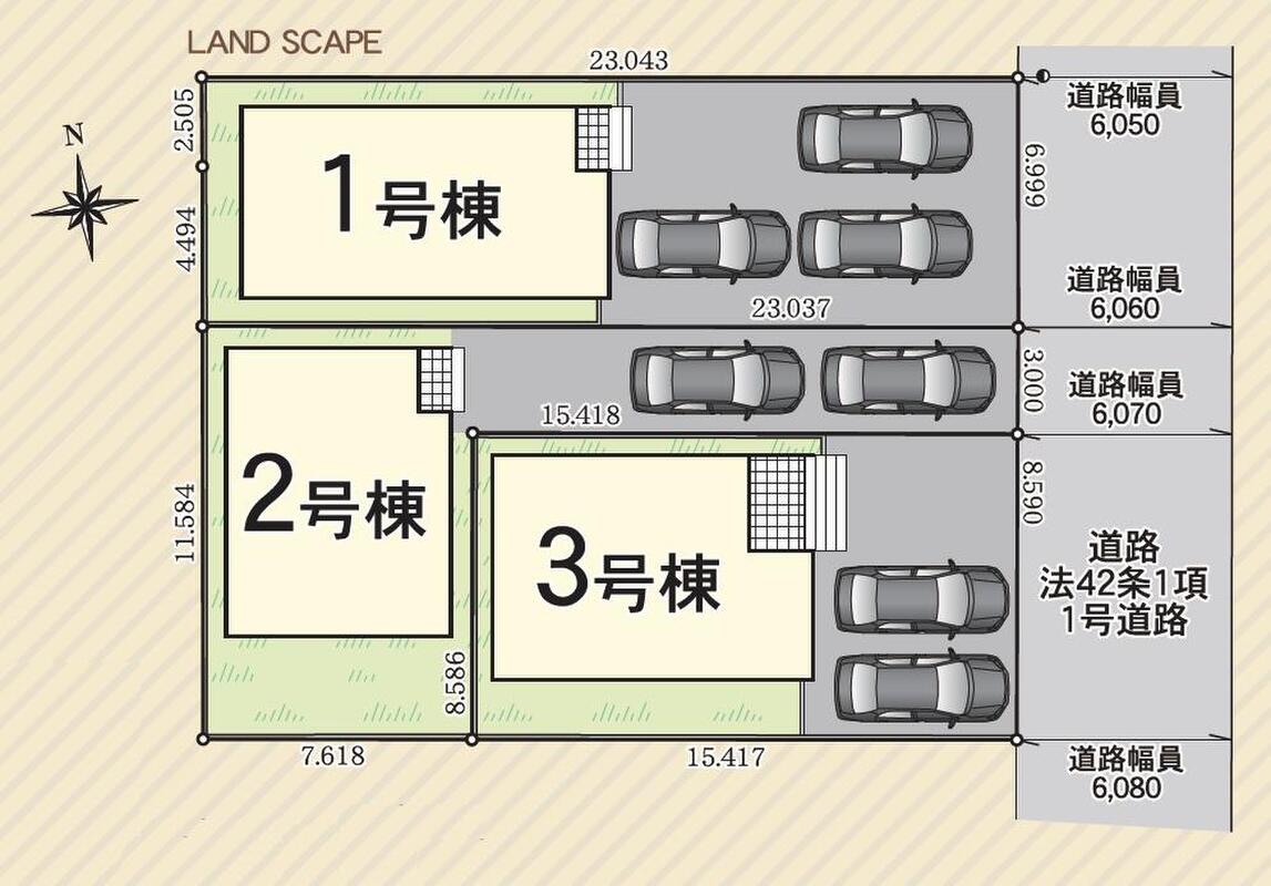 | 駐車場 | 2台 ~ 3台(1号棟(3台)・2~3号棟(2台)) | 道路の幅員 | 道路幅:6m、アスファルト舗装、東側 約6.0m 公道接道 |