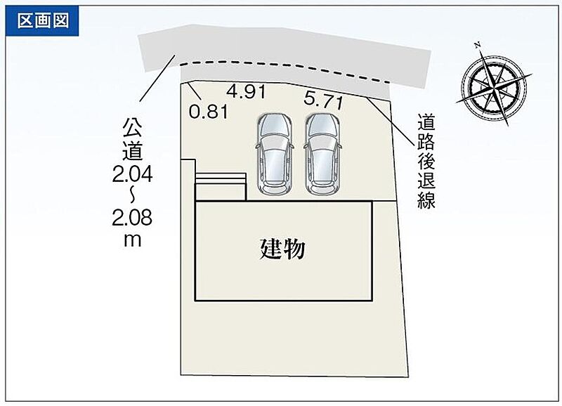 | 駐車場 | 2台 | 道路の幅員 | 道路幅:2m、アスファルト舗装、北側 約2.04m~2.08m 公道接道 |