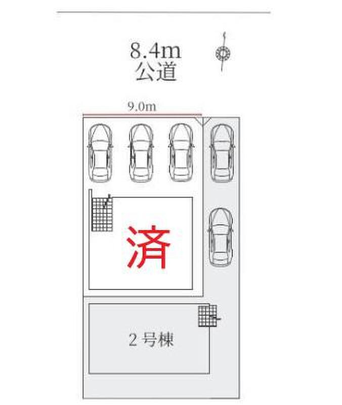 | 駐車場 | 2台 | 道路の幅員 | 道路幅:8.4m、アスファルト舗装、北側 約8.4m 公道接道 |