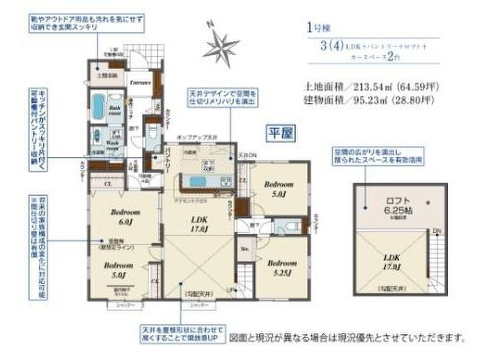 【平屋住宅】敷地64坪超♪安心の耐震+制震&長期優良住宅♪並列駐車2台可!優れた家事導線&LDKにはとこだわりの勾配天井採用♪ロフト♪ハイグレード仕様♪フレキシブルルーム対応♪ぜひお問合せください!