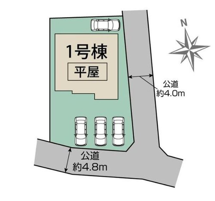 | 駐車場 | 4台 | 道路の幅員 | 路幅:4m・4.8m、アスファルト舗装、東側4.0m公道、南側4.8m公道 |