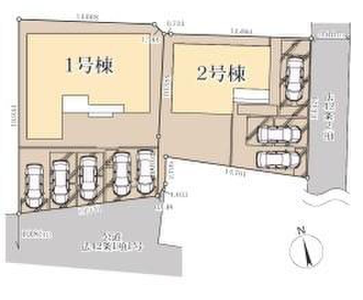 | 駐車場 | 3台 ~ 5台(1号棟:5台、2号棟:3台) | 道路の幅員 | 道路幅:3m~10m、アスファルト舗装、東側3m公道、南側10m公道 |