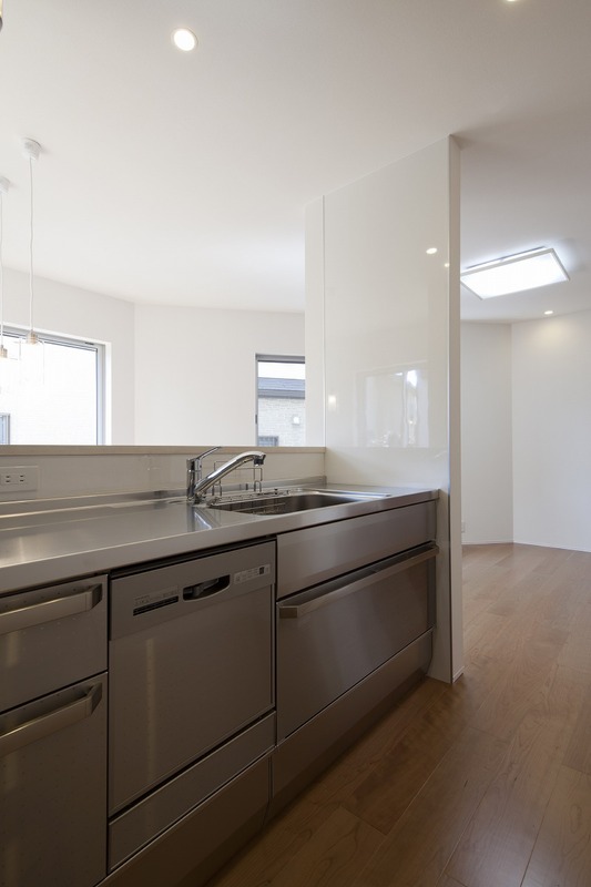 角地の魅力を活かした陽当りのいい住まいをプラン。大きな吹抜けのあるLDKは開放的で居心地のいい空間です。キッチンからはリビングを見渡すことができ、家事をしながらでもお子様の様子を見守ることができ