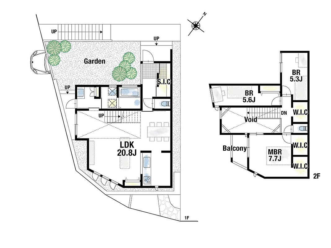 2階には家族共用のW.I.Cを完備。主寝室には夫婦専用のW.I.Cもあり、整理整頓が隅々まで行き届きます。さらに、風雨から大切な愛車を守る堀込みガレージをご用意しており、利便性も追求しています。