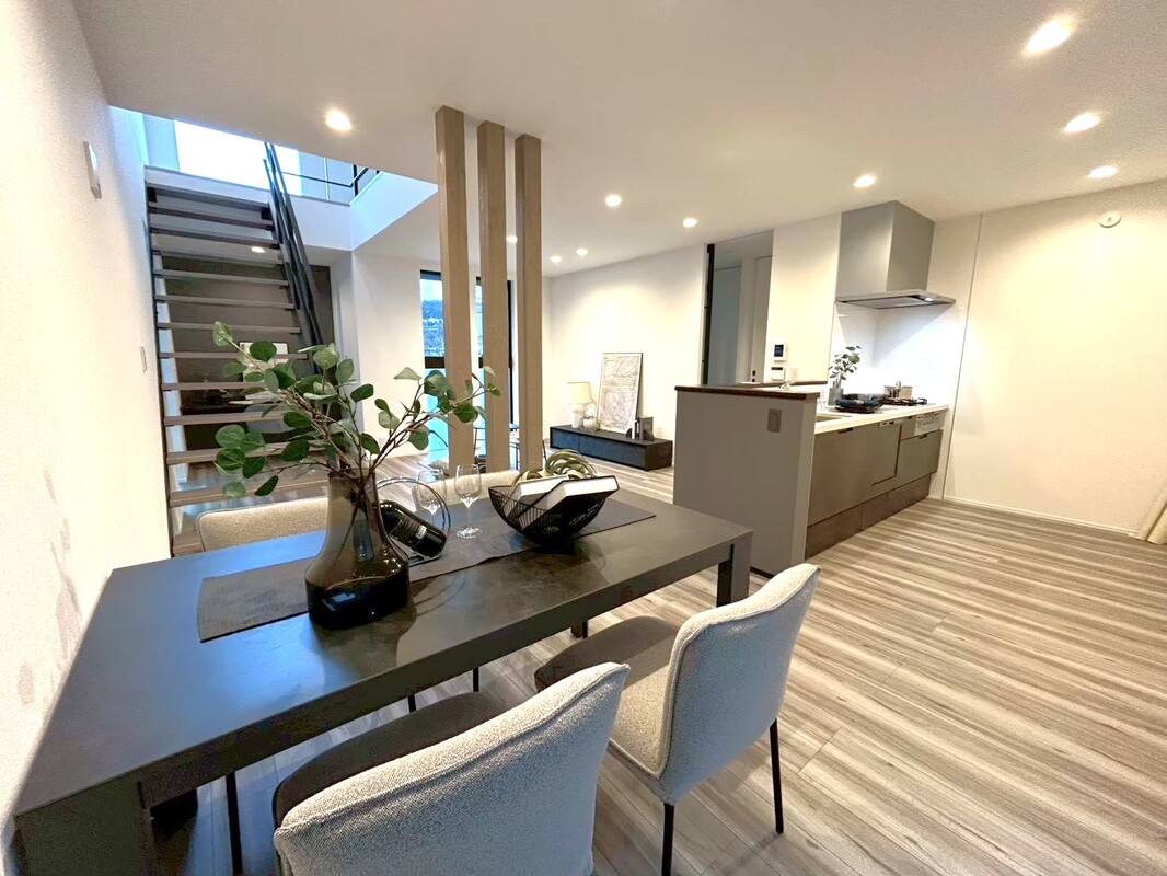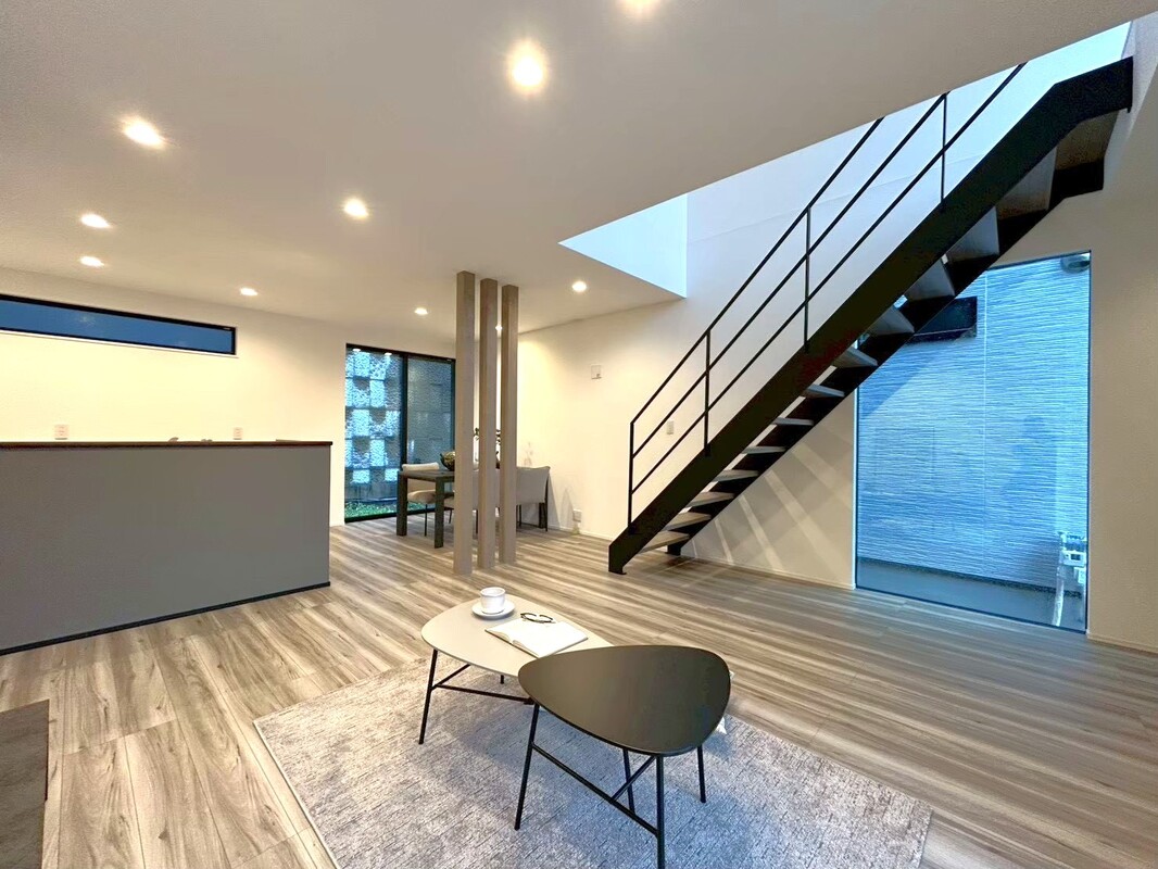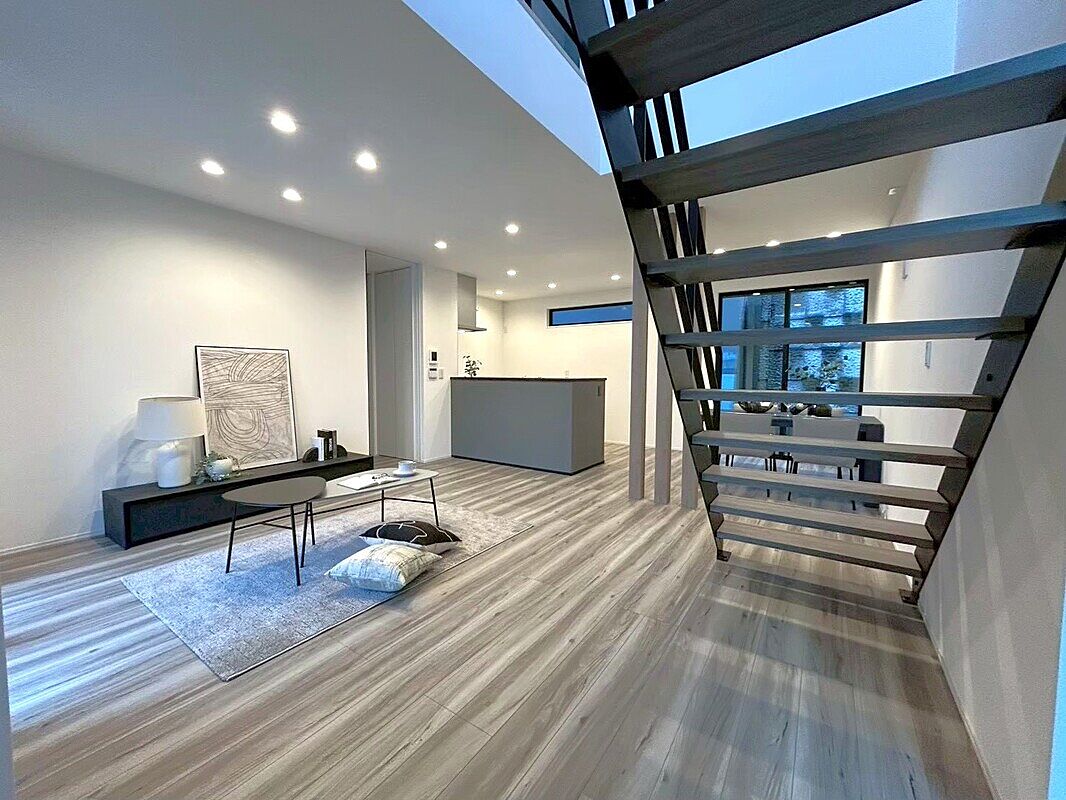 20帖以上の広さをもつLDKを設け、開放感あふれる空間を実現しました。リビング階段は自然と家族に会話を生み、吹抜けを組み合わせることで2階との繋がりを感じさせます。