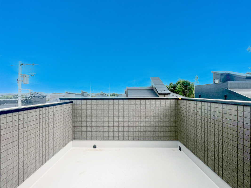 ルーフバルコニーや大型ワイドバルコニーなど、空が広く青く感じられる邸宅