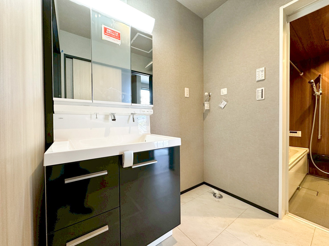 ゆとりの洗面スペースで朝の身支度も快適スムーズに。3面鏡で髪の...