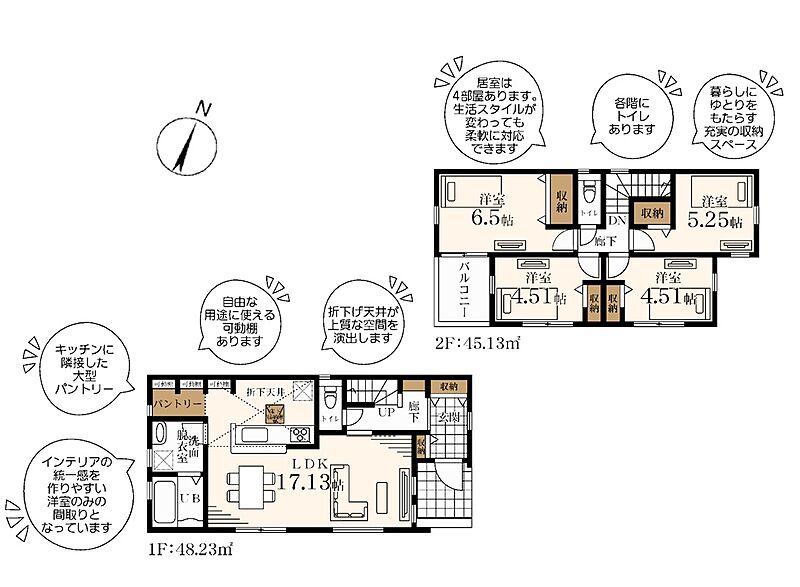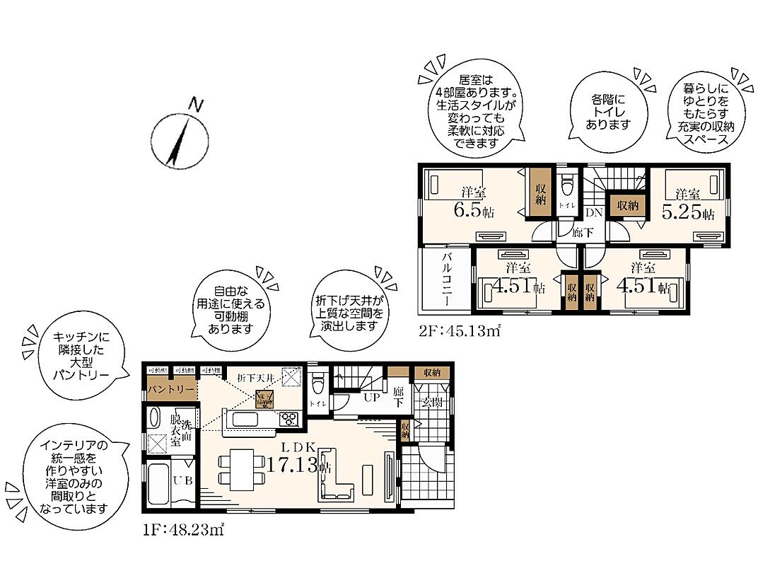 食洗機や浴室乾燥機も標準装備!居室収納だけでなく、玄関収納や廊下収納、大型パントリー収納など空間を広々使える造り!
