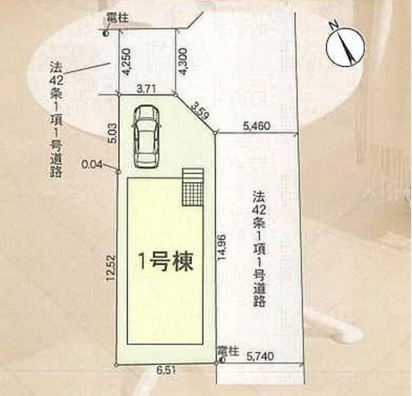 | 駐車場 | 1台 ~ 2台(※車種による) | 道路の幅員 | アスファルト舗装、南東側5.46m公道、北東側4.25m公道 |