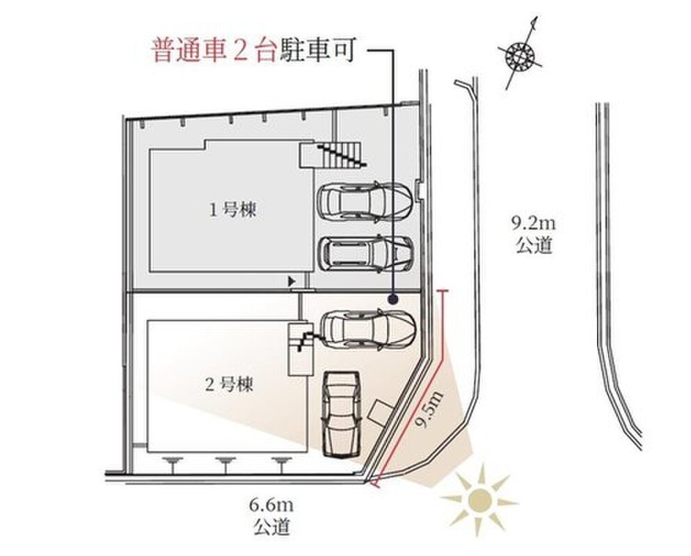 | 駐車場 | 2台 | 道路の幅員 | 道路幅:6.6m~9.3m、アスファルト舗装 |