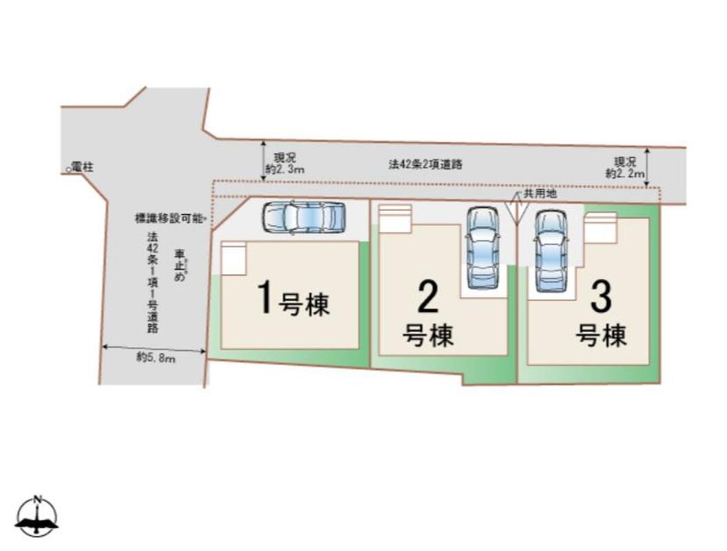 | 駐車場 | 1台 | 道路の幅員 | 道路幅:2.3m・5.8m、アスファルト舗装、西側約5.8m公道、北側約2.3m公道 |