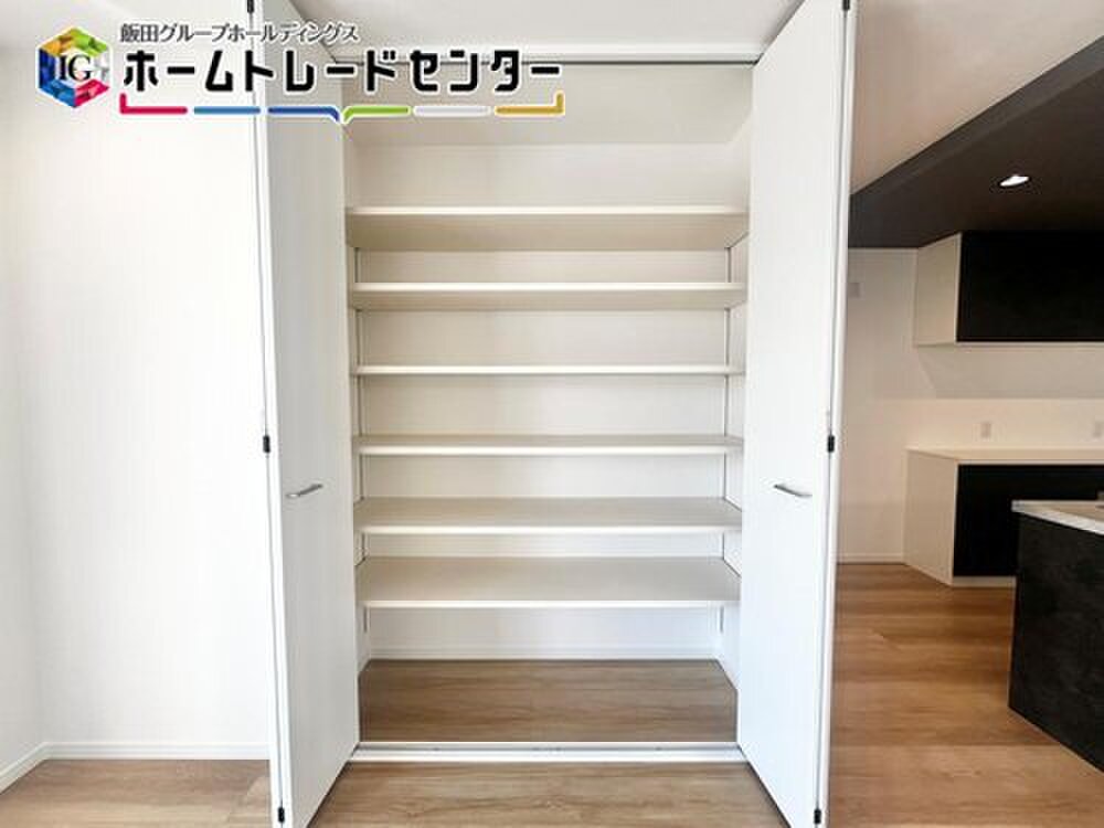 リビングやキッチン横にはパントリーにもなる大型収納を完備しました。棚付きだから小分けのボックスを入れて自分仕様に!これであなたも収納上手♪